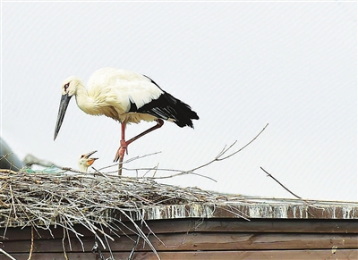 东方白鹳的巢筑在百鸟苑观赏亭顶端。经一个多月的时间,雏鸟双亲孵卵,已有3只东方白鹳幼鸟顺利孵化。饲养员介绍,动物园尽可能地为园内鸟类提供自然孵化的环境,避免人为干预。接下来的日子,育雏是鸟类繁衍中最脆弱的阶段,在孵卵及育雏期间的过度干扰很可能会导致雏鸟父母弃巢,繁殖失败。因此在鸟类繁殖期,饲养员需保持足够的距离,并缩短观察时间,避免干扰它们。
