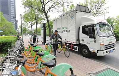 5月2日,在滨河东路桃园三巷段,市公交公共自行车公司的工作人员在合理调运公共自行车。随着太原市滨河自行车道的开通,滨河东西路公共自行车站点租还车压力增加。为此,该公司工作人员放弃假日坚守一线,加大滨河东西路沿线公共自行车站点调运频次,以保障市民的租骑需求。 梁 琛 陈 晨 摄