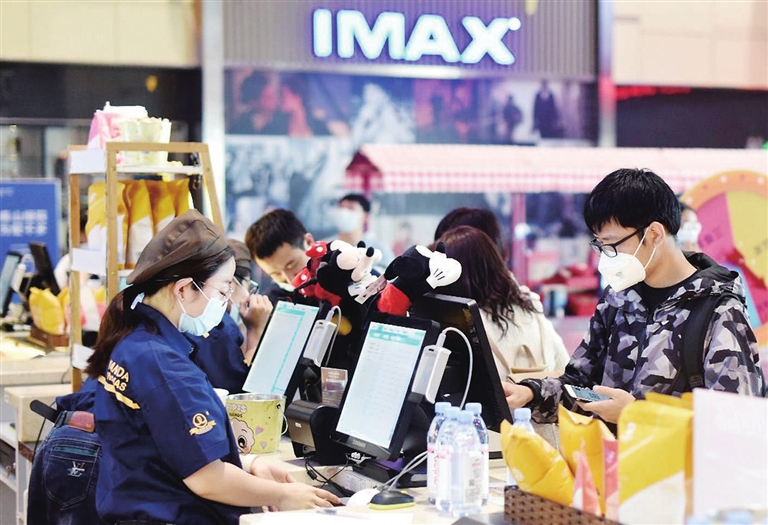 5月4日,省城一影院内,前来观影的顾客络绎不绝,除多台自助取票机同时“工作”外,影院前台也排起了购票长队。“五一”假期,我市各大电影院迎来客流高峰,影院皆增加了放映场次。同时,切实加强疫情防控,树牢安全意识。 邓寅明 摄