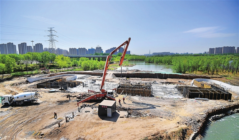 5月4日,汾河四期治理美化工程柴村桥段建设工地上,各种大型机械车辆往来穿梭,机器轰鸣声此起彼伏,施工人员坚守岗位,奋战一线,加快推动项目建设。 牛晨阳 摄