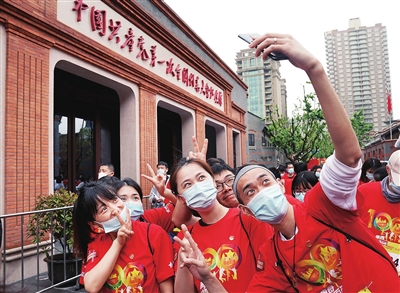 5月4日,在中共一大纪念馆国旗广场,参加五四主题集会的青年们在自拍合影。 当日是五四青年节,上海青少年庆祝中国共产党成立100周年“五四”主题集会在中共一大纪念馆国旗广场举行。随后,近千名青少年从中共一大会址冒着风雨出发,进行“青春耀百年 永远跟党走”上海青少年红色大寻访接力活动。寻访活动共四条路线,覆盖16个红色场馆及地标,让青少年以沉浸体验的方式,切身感受红色城市的荣光。 新华社记者 刘 颖 摄