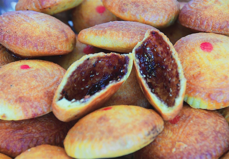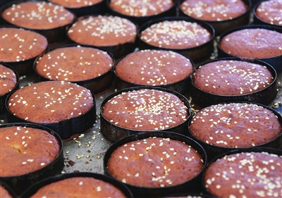在海维食品厂的制作车间,只见工人师傅提面粉,揉面团,依次切开,抹一把油酥涂上面饼,刷一层蛋液撒一撮芝麻,搓条,下剂,按扁,包酥,烤炉里的那抹金黄冒出欢快的滋滋声,让人充满念想。一只小小的饼,浸染了几代人的记忆。
