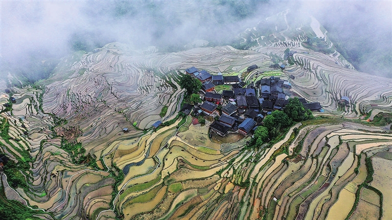 立夏前后,位于贵州省黔东南苗族侗族自治州从江县大山深处的加榜梯田蓄水丰盈、线条分明。青山环抱着梯田,苗寨点缀其间,在不同的光线下呈现出不同色彩,如诗如画。