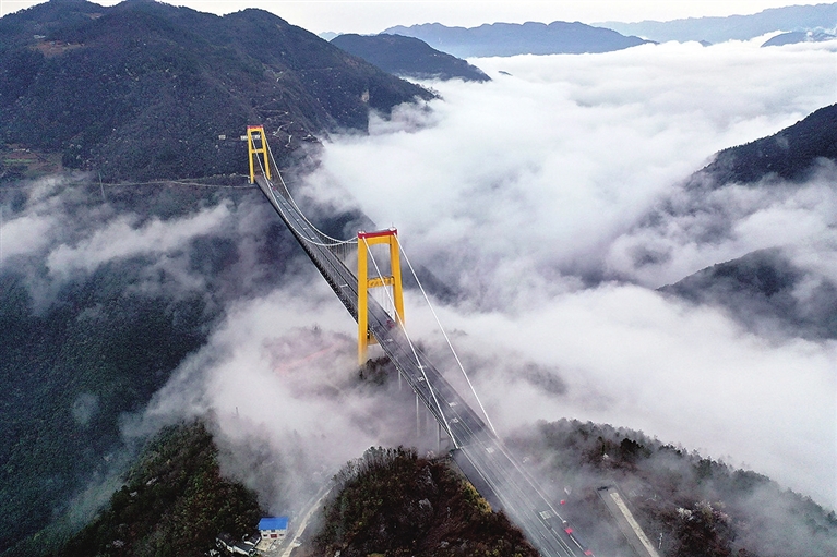 ①在湖北省恩施土家族苗族自治州拍摄的沪渝高速公路四渡河大桥(2019年3月23日摄,无人机照片)。 新华社发(杨顺丕 摄)