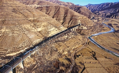 ③重载列车行驶在桑干河旁的大秦铁路上(2018年12月6日摄,无人机照片)。