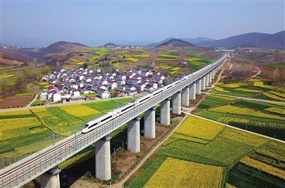 ④动车组列车行驶在西成高铁陕西汉中洋县段(2019年3月20日摄,无人机照片)。
