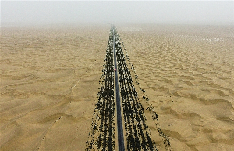 ⑤汽车行驶在新疆塔克拉玛干第一条沙漠公路上(2018年6月12日摄,无人机照片)。