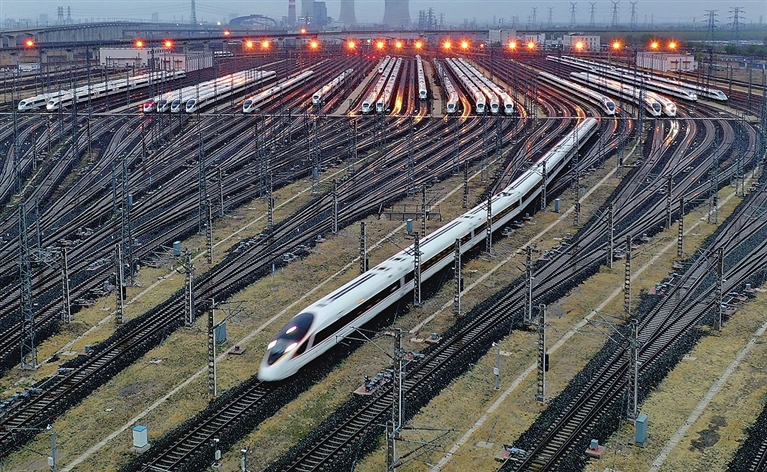 ⑦一列复兴号动车组列车驶出天津动车所停车场(2019年4月9日摄,无人机照片)。