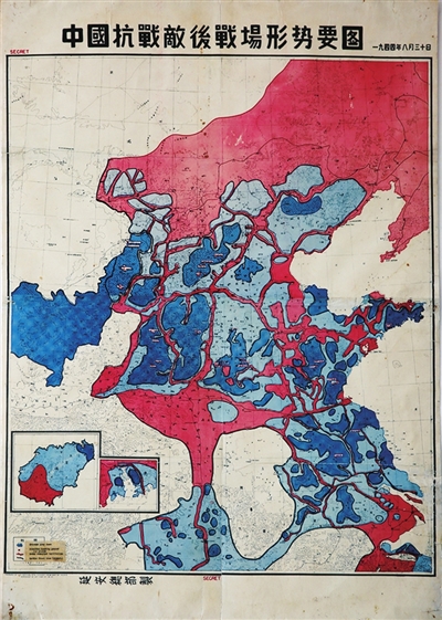 图中红色部分为日军控制地区,可以看出日军“以铁路为柱、公路为链、碉堡为锁”的“囚笼政策”。灰色为国民党军控制区,蓝色部分为中国共产党领导的敌后武装力量控制地区。同时在蓝色区域标示着多处可能为飞机提供临时着陆地区的位置。抗战期间曾随八路军总部机关奔赴山西抗日前线、任中共中央军委二局情报部门负责人的冯维精将军的家人,1998年向山西烽火抗战博物馆的创始人捐赠了一批革命文物,此系其中之一。