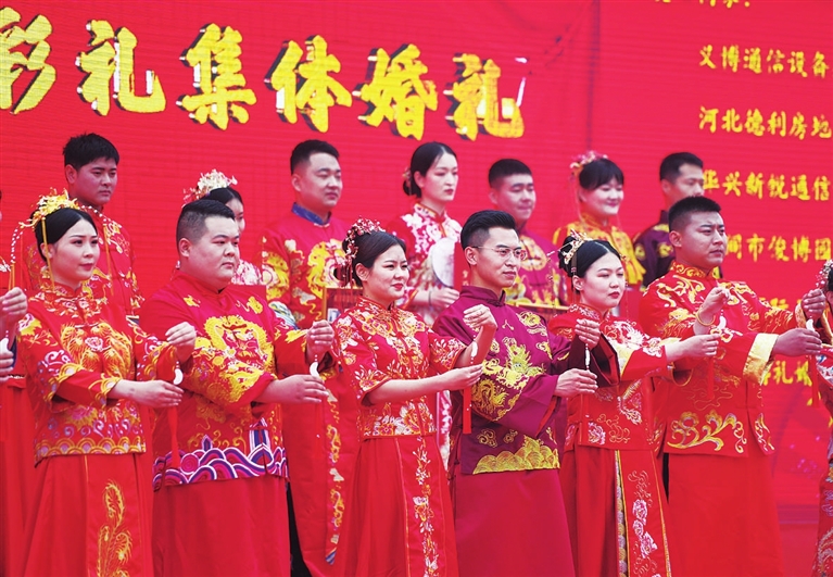 5月20日,河北省河间市在瀛海公园举办“零彩礼”公益集体婚礼,26对新人身穿中式传统婚服执手入场,倡导“移风易俗、婚事新办”新理念,引领文明节俭的婚嫁新风尚。新华社记者 朱旭东 摄