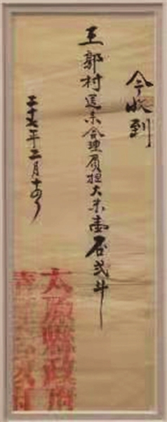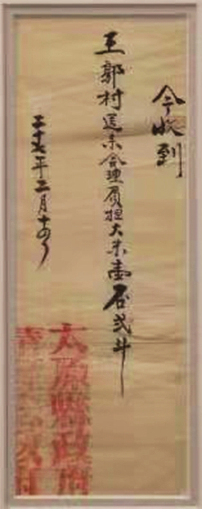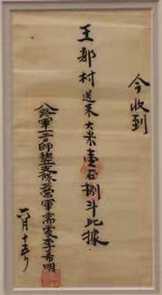 “收到 王郭村公所送来大米一石五斗。下短之米并鞋赶快送来为要。第八路军一二O师三五八旅七一四工作团 主任汪(汪发远印) 廿七年五月廿六日”。
