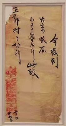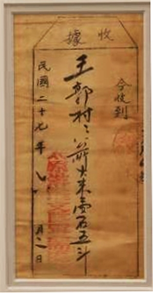 “今收到 王郭村公所白兆蓉送来大米六小斗枪二支手掷弹一个,足见贵村爱国,本队感激莫铭。此致贵村公所先生台鉴。未送足之数祈另明日送来,是为至盼。太原县二支队”,落款公章为:民族自卫战争战地总动员委员会第一路总队第二支队部。