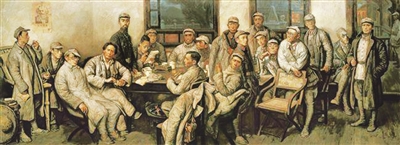 沈尧伊在油画语言中融入了木刻风格,硬度的版画线条与体积结构、明暗相结合,使得人物形象的塑造结实而富有雕塑感;画家运用有变化的暗灰色调,在色阶上压缩色彩区域,从而营造出具有历史性的会场空间。