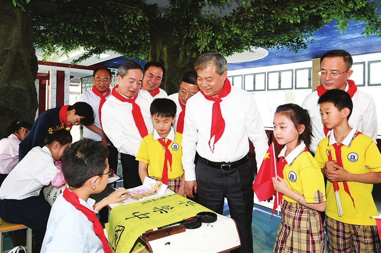 公园路小学的校园里一派节日气氛。罗清宇一到这里,孩子们就围拢上来,为他系上鲜艳的红领巾,并热情邀请他参加“红领巾心向党——争做新时代好队员”庆“六一”主题活动。全国红旗中队——四·六中队正举行《榜样》主题队会,罗清宇轻轻就座、认真聆听,当听到雷锋、袁隆平、钟南山等都是孩子们心中的榜样时,罗清宇动情地说,榜样的力量是无穷的,从你们身上看到了太原少年儿童的风采,看到了祖国的未来,希望同学们弘扬榜样精神,努力增长本领,树立远大理想,从小听党话、感党恩、跟党走。随后,罗清宇向孩子们赠送党史图书,并参观学校“一带一路”世界地图沙盘、立体星空顶、全息投影地球仪等教学区,观看书画比赛,与孩子们互赠礼品,勉励他们刻苦学习知识,积极锻炼身体,争当能够担当民族复兴大任的时代接班人。