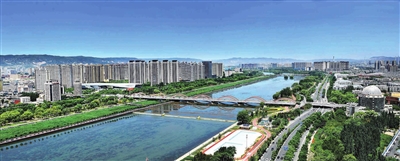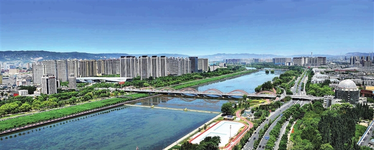 6月3日,我市天气晴朗。远眺汾河景区,蔚蓝的天空,青翠的树木,将整个城市映衬得更加绚丽多彩、美好宜人。 柴杰梁 摄