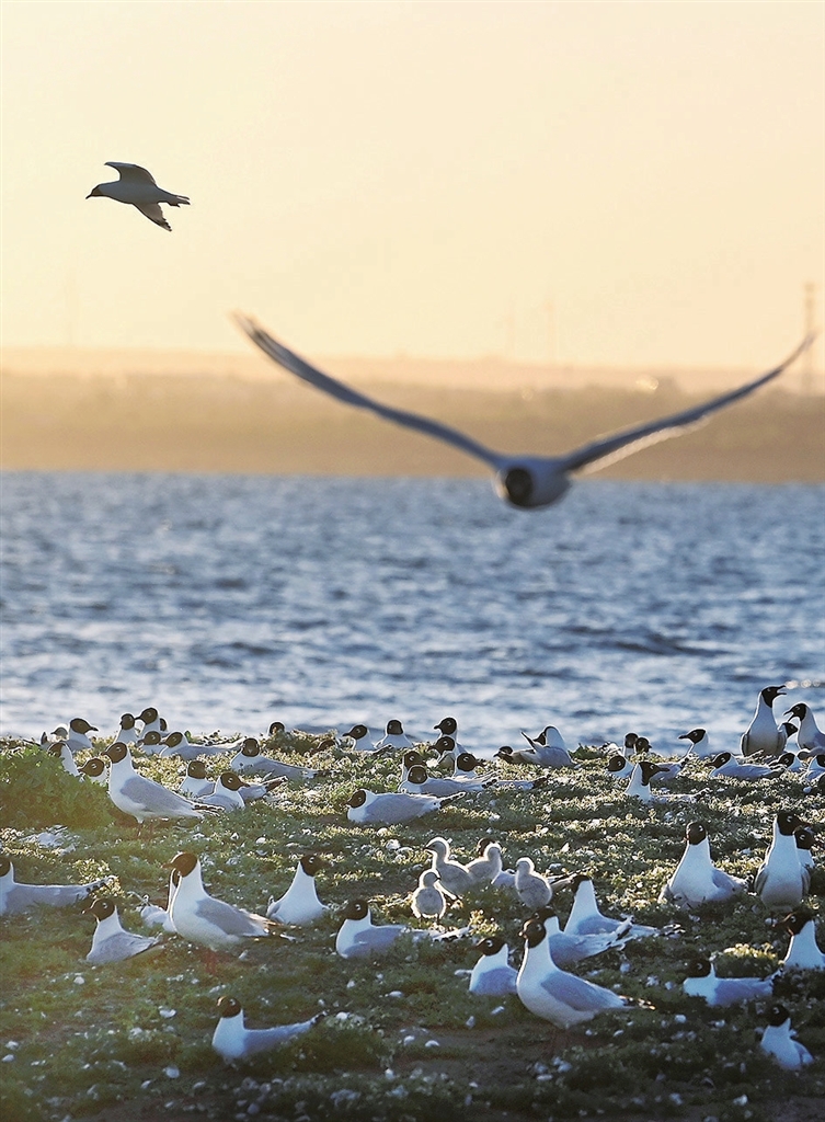 朝霞沐浴着红碱淖的鸟岛(6月3日摄)。 近期,随着气温升高,陕西省神木市红碱淖湿地保护区成了遗鸥的乐园,遗鸥在这里觅食嬉戏、孵化后代。 遗鸥是濒危候鸟,被列入世界自然保护联盟濒危红色名录。 新华社记者 陶 明 摄