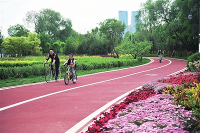 6月6日,汾河景区内,市民一边骑行,一边欣赏沿途美景。滨河自行车道开通以来,越来越多的市民前来“打卡”体验,感受优美的风光与健身的快乐。人与自然和谐共处的生态画卷跃然眼前。 柴杰梁 摄