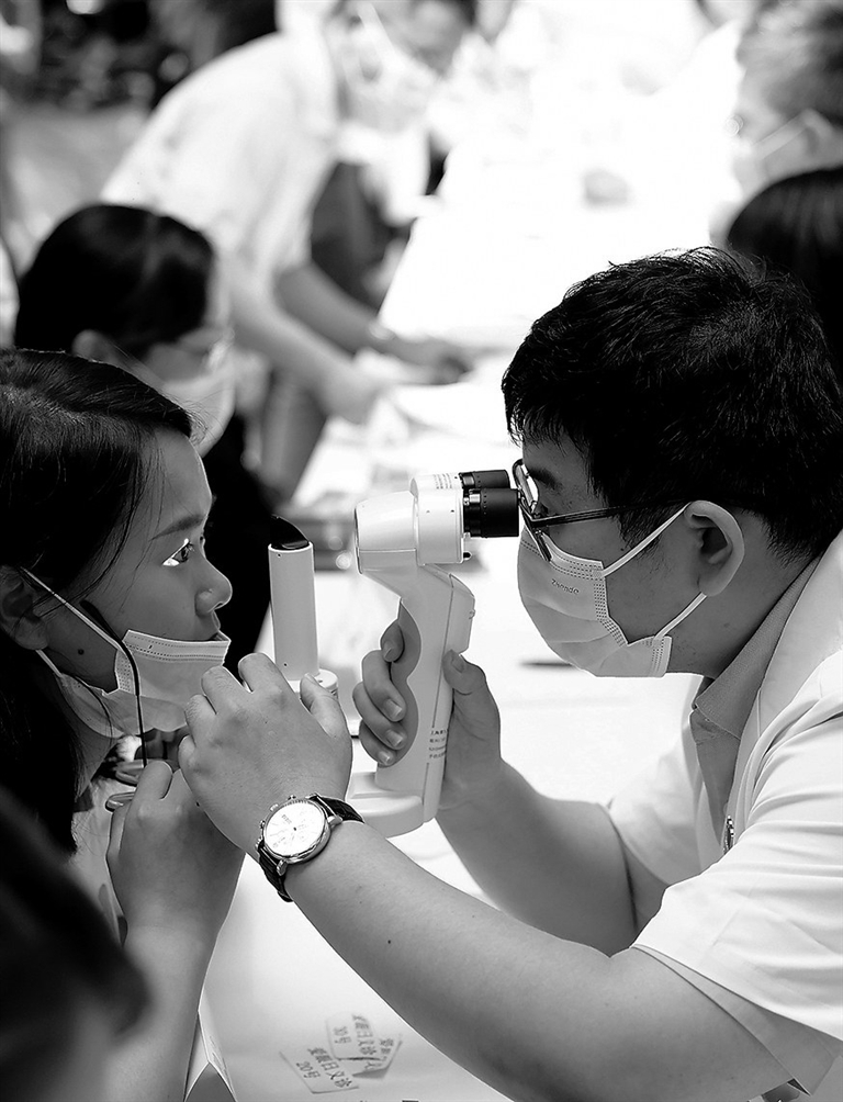 6月6日,医务人员在上海虹桥火车站候车大厅为旅客检查眼睛。 当日是第26个全国爱眼日。上海交通大学医学院附属第九人民医院眼科党支部与上海虹桥火车站党总支在上海虹桥火车站联合开展科普宣讲及义诊活动。 新华社记者 陈 飞 摄
