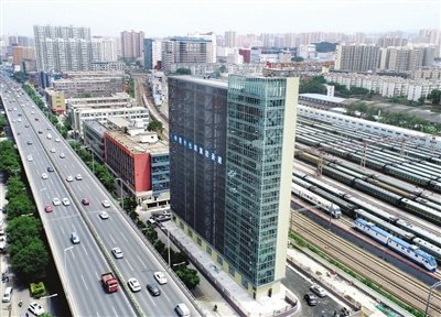 6月7日下午,记者在位于建设南路与双塔寺街交叉口东北角的该停车楼现场看到,工人们正在安装载车板,仅用时约10分钟,一块载车板就可以安装到位。站在楼下,向上仰视,大楼如利剑直插云霄,极具美感。
