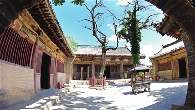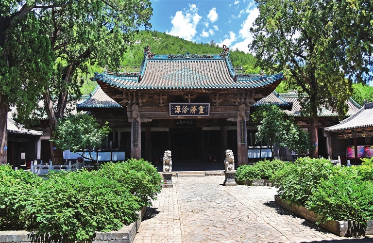 二进院正面为藏经楼,东侧是文殊阁,西侧是黑龙殿。文殊阁下石砌窑洞为傅山读书处,俗称红叶洞,洞前石壁上傅山遗墨犹存。三进院落主要建筑为千佛殿。