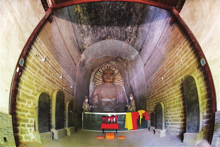 寺院坐北向南,南北长130米,东西宽40余米,三进院落。前院主要建筑为西南部的大佛洞,洞前有高台,台上依高峭的土崖筑有重檐歇山顶式楼阁1座,阁内土洞深17.7米、高12米,砖石结构,内供一泥塑的阿弥陀佛像,高10米,盘膝向东而坐。此像雄伟壮观,雕塑技艺精湛,既有天竺古佛神采,又显中华古代乡民风貌。佛前二菩萨立像分列左右,阁前台阶下有一对雕刻于金代的石狮。