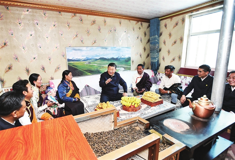 习近平走进家中,屋里屋外仔细察看,并同一家人围坐在客厅聊家常。索南才让激动地说,牧民生活好,全靠党的政策好,衷心感谢共产党,衷心感谢总书记。习近平指出,今年是中国共产党成立一百周年,我们党发展壮大起来不容易,夺取政权不容易,建设新中国不容易。老百姓衷心拥护中国共产党,就是因为中国共产党始终全心全意为人民服务、为各民族谋幸福。