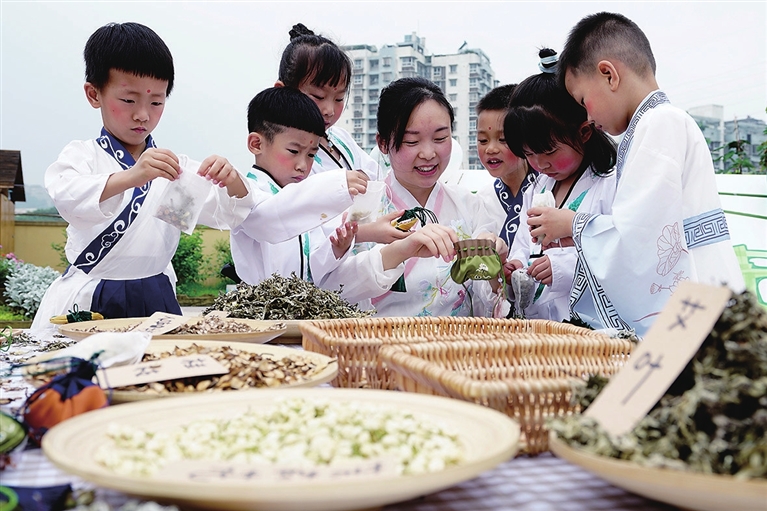 6月10日,在重庆市北碚区缙云幼儿园,老师指导孩子制作香囊。