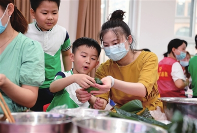6月10日,在合肥市肥西县花岗镇董岗幼儿园,小朋友和家长一起包粽子。