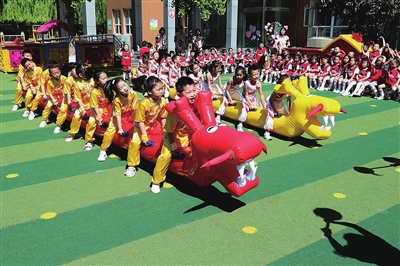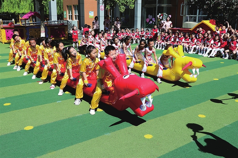 6月10日,河北省张家口市万全区第一幼儿园的小朋友参加旱地龙舟比赛。