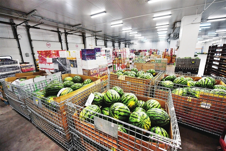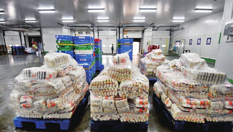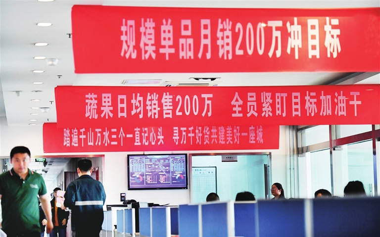 清徐县太茅路高花段228号,美特好农产品配送物流有限公司坐落于此。进入巨大的作业区,“爱岗敬业、求实创新、用心服务、勇争一流”的红色标语赫然入目。园区地面上,一排排摆满物品的蓝色货架高高耸立,货架边不时有各种作业车来往穿梭卸货取货。一旁的电子屏幕上,精确记录着当日各项出库任务。 来到生鲜加工中心,身着绿色马甲的工人们正在快速地分装豆角。原来,这些都是为美特好线上销售准备的货品,提前按照统一规格备好,顾客一下单就能迅速配送。来到青菜存储区,这里体感温度明显低一些,在低温的保护下,绿叶蔬菜保持着水润新鲜;而到了冷冻区,极低的温度让人不由冷的发抖,里面作业的工人无一例外地穿着厚厚的棉衣。工作人员介绍,为了保证所有食物最好的品质,物流园对商品分门别类设置了不同的储存温度:加工作业区温度带为6~12℃,保鲜温度带为2~5℃,冷藏库4℃,冷冻库-18℃,肉食、面条急冻库为-35℃。在熟食加工中心,工人们正专心致志地炸制花生米、肉丸子,烤制着香肠…… 在一个摆满了各种实验器材的房间内,两位工作人员正在认真地对食品进行着化验、分析,这是物流园专门配备的化验室。为了最大限度保障食物的安全健康,专业人员每日都要对食物样品的各项指标进行检测。