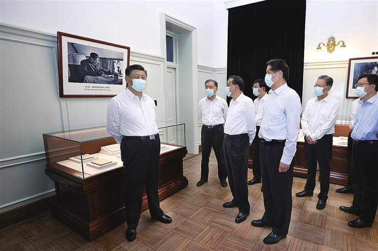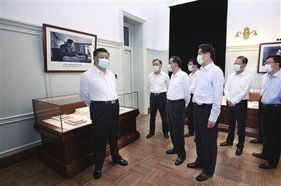 25日下午,习近平带领中央政治局同志来到北大红楼,参观“光辉伟业 红色序章——北大红楼与中国共产党早期北京革命活动主题展”,重温李大钊、陈独秀等开展革命活动、推动马克思主义在中国早期传播、酝酿和筹建中国共产党等革命历史。展厅内,一张张图片、一件件文物,全面展现了那个时期的光辉历史。习近平不时停下脚步,询问相关细节。他指出,北大是新文化运动的中心和五四运动的策源地,最早在我国传播马克思主义思想,也是我们党在北京早期革命活动的历史见证地,在建党过程中具有重要地位。要加强红色资源保护和利用,尊重历史事实,准确评价历史,正确学史用史。