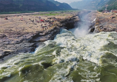 6月27日,游客在山西吉县黄河壶口瀑布景区游览(无人机照片)。