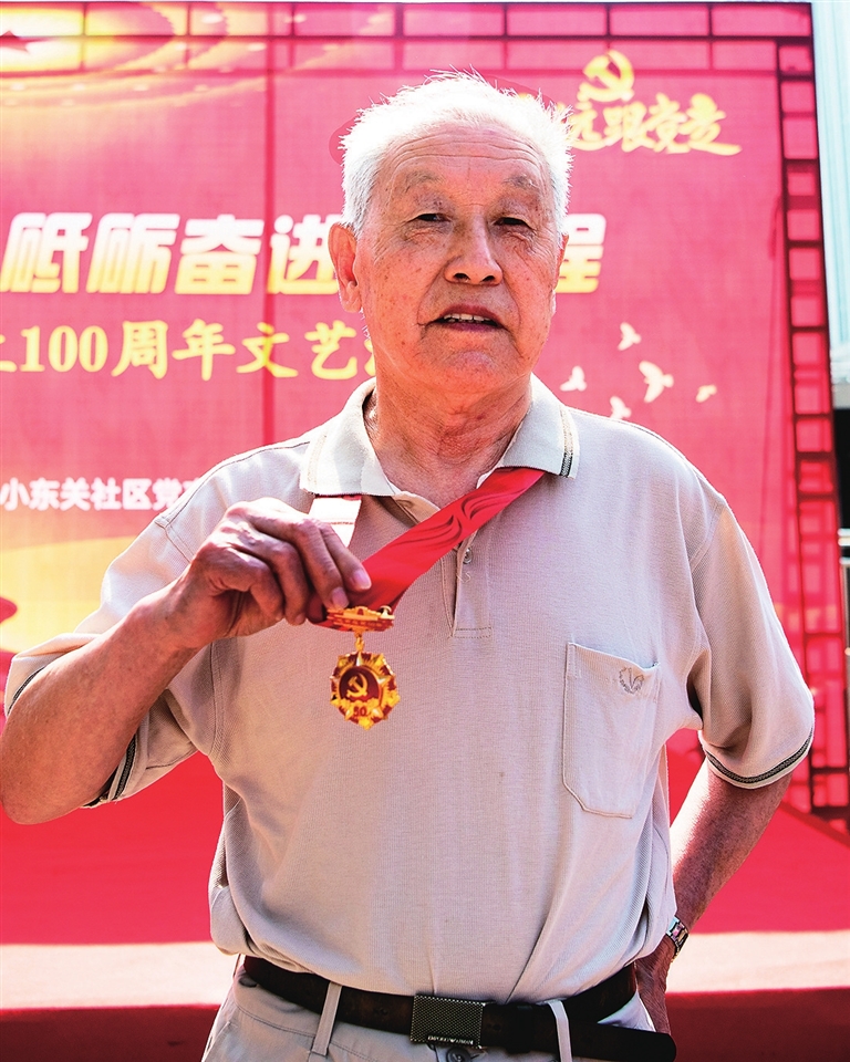 | 杏花岭区小东关社区80岁老党员韩国政展示自己的“光荣在党50年”纪念章。 聂行明 摄 |