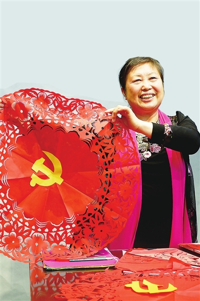 | 我省工艺美术大师、剪纸非遗传承人辛爱英用作品表达自己对党的热爱。 李喜明 摄 |