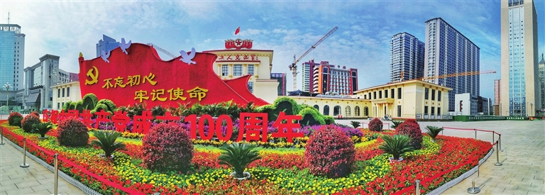 | 南宫广场上,“不忘初心,牢记使命”庆祝中国共产党成立100周年的主题花坛烘托出浓厚的节日气氛。王红兵 摄 |