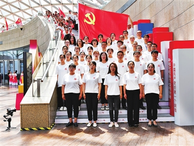 | 市民在商场内进行庆祝中国共产党成立100周年“闪唱”活动。 高玉平 摄 |
