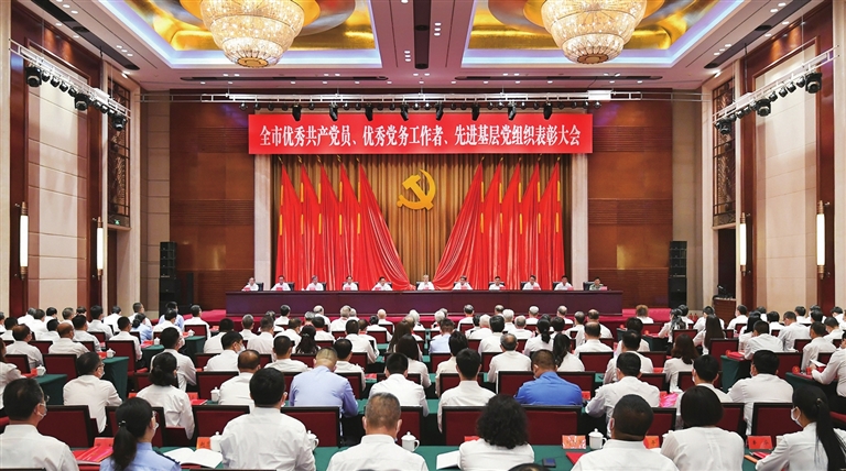 上午8时30分,大会开始,全体起立,奏唱国歌。来自全市各行各业、在工作中取得优异成绩的150名优秀共产党员、150名优秀党务工作者和150个先进基层党组织被授予荣誉称号。市领导为受表彰的先进集体和个人代表颁奖,会场响起热烈掌声。