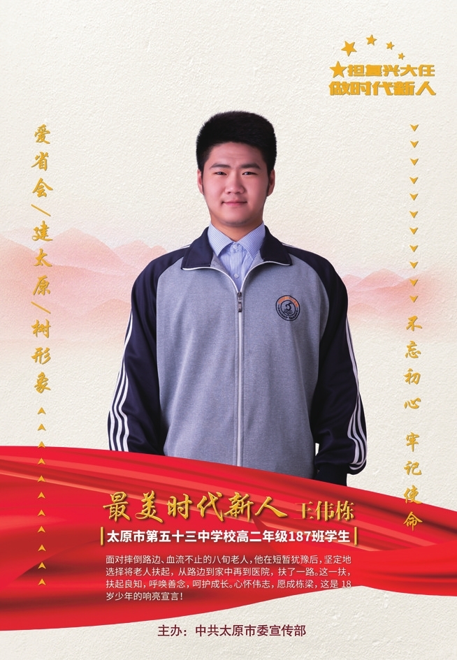 面对摔倒路边、血流不止的八旬老人,他在短暂犹豫后,坚定地选择将老人扶起,从路边到家中再到医院,扶了一路。这一扶,扶起良知,呼唤善念,呵护成长。心怀伟志,愿成栋梁,这是18岁少年的响亮宣言!