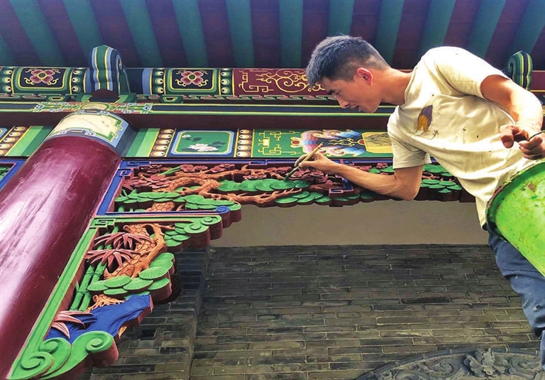 7月6日,在钟楼街改造施工现场,施工人员正在精心装饰建筑外立面。目前,整个改造工程进展顺利,沿街建筑主体已基本完工,进入到内部装修阶段,路面铺筑工程也同时展开。 米国伟 摄