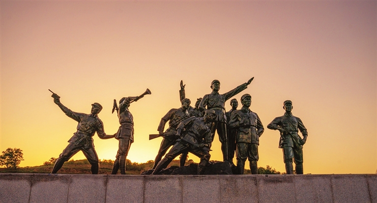 这是一幅剪影般的八路军指战员雕塑像。日落时分,满天金色,更衬托出八路军指战员的雄壮、高大,渲染出强烈的革命英雄主义精神。