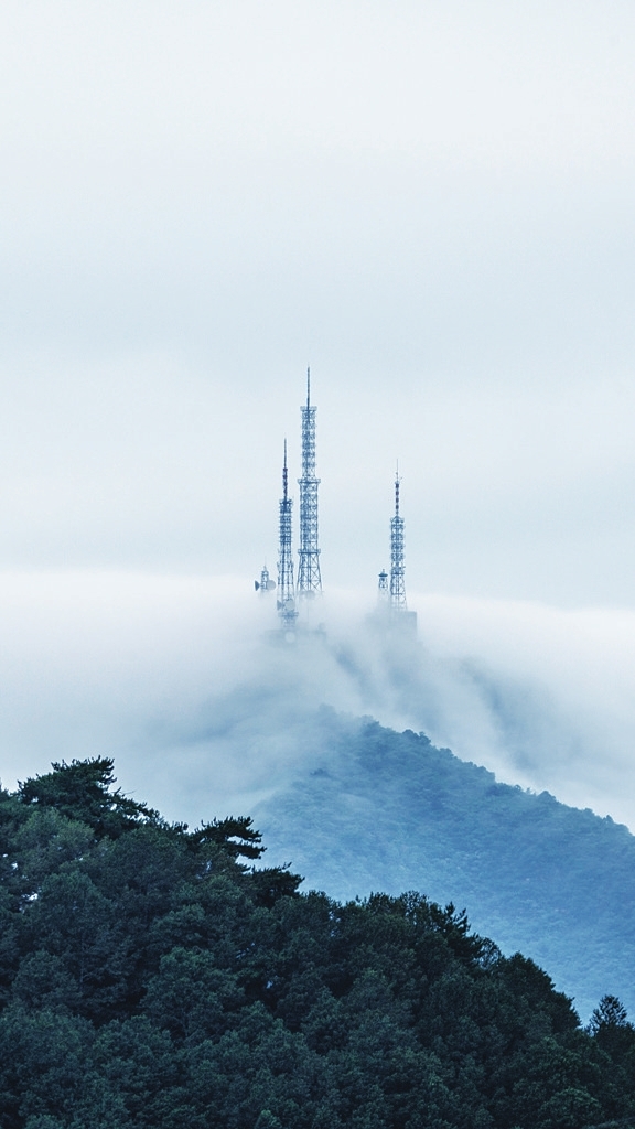 作者拍摄的这座山,山高林深,风雨欲来,云雾迷蒙,几座高高的发射塔架若隐若现,好似一幅淡雅的中国水墨画,又似一幅绝美的海市蜃楼图。 ——编者
