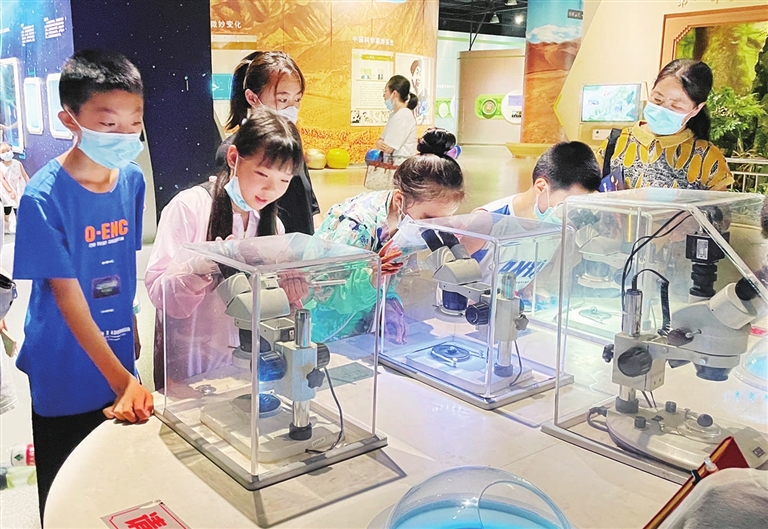 7月15日,山西省科学技术馆人气十足,每日两千张预约门票十分抢手,众多家长带孩子前往这里参观,寓教于乐,感受科学的魅力。 邓寅明 摄