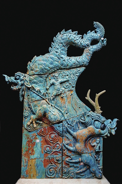 展厅中一件“庞然大物”令人惊叹。这是永乐宫三清殿屋脊上的琉璃构件,首次走出芮城,与公众见面。这组构件釉色艳丽,造型华美,由两件鸱吻和一组屋顶正脊组成,总长近10米,重达1吨,彰显出三清殿建筑恢弘的气势。