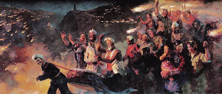 画面用深沉的笔调衬托出明亮的火光,以及火光照耀下人们的喜悦表情,鲜明的明暗对比,突出了场景的庆祝氛围,也隐喻着光明照亮了黑暗,黎明将要到来,这是时代的光辉记录。