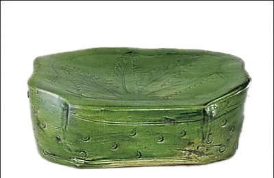 这件宋代吉州窑绿釉划花枕,高9厘米,面26×22厘米,底24×19厘米。枕面前低后高,枕体中空。为防止烧造变形,在后壁留有一个出气孔。从侧面一边留着的四个支烧痕看,说明当时为竖立烧制。