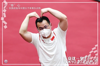 上图:7月20日,中国女子举重队主教练张国政在热身训练中比心。