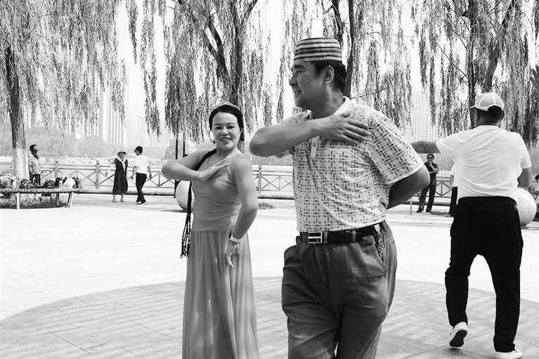 新疆舞节奏明快,男女舞伴或刚健有力,或柔婉婀娜,腿步变幻,双手舞动,给人美的享受,也是一项健身活动。图为龙潭公园的新疆舞爱好者翩翩起舞。 溪 泯 摄
