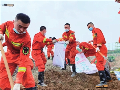 21日,山西消防接到河南洛阳偃师生活垃圾无害化处理厂固坝任务。该厂存放生活垃圾百万吨以上,因连日降雨,导致北侧坝体出现裂缝,存在溃坝风险。一旦发生溃坝,生活垃圾将污染土壤,对附近居民生活、农业生产、用水安全造成严重危害。经连夜制定固坝方案,22日晨,山西消防增援力量立即开展固坝工作。由于当地土壤受暴雨侵蚀十分疏松,无法使用机械加固,只能采取人力作业。消防指战员现场制作沙袋,采取人力肩扛的方式执行固坝任务。现场环境恶劣,消防指战员衣服、口罩全部湿透,也没一个喊累。