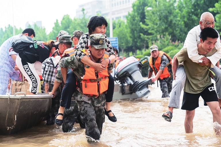 中部战区相继派出44批次救援梯队、8360名官兵,在郑州、洛阳、新乡等30余个险情地段投入救援。