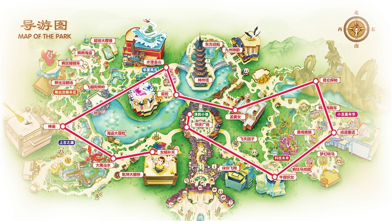 线路三:魅力传说之旅。这条线路以沉浸体验为主。您可先后游玩牛郎织女、成语童话、昆仑探秘、孟姜女、梁祝、水漫金山、神画、大禹治水、女娲补天等项目。